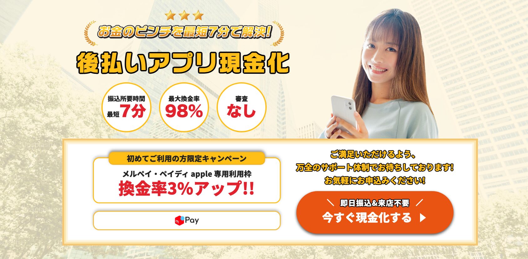 初めての後払いアプリ現金化で不安でしたが、WEB申込フォームから申込したらすぐに電話で連絡があり、換金率の仕組みや振込までの流れを詳しく説明してくれました。手続きも本人確認書類を送るだけで簡単でした。15万円の利用で96%、約14万4000円の入金でした。高額利用だと換金率がかなり高いようです。メルペイに対応しているのも便利でした。(神奈川県・36歳・男性・自営業)