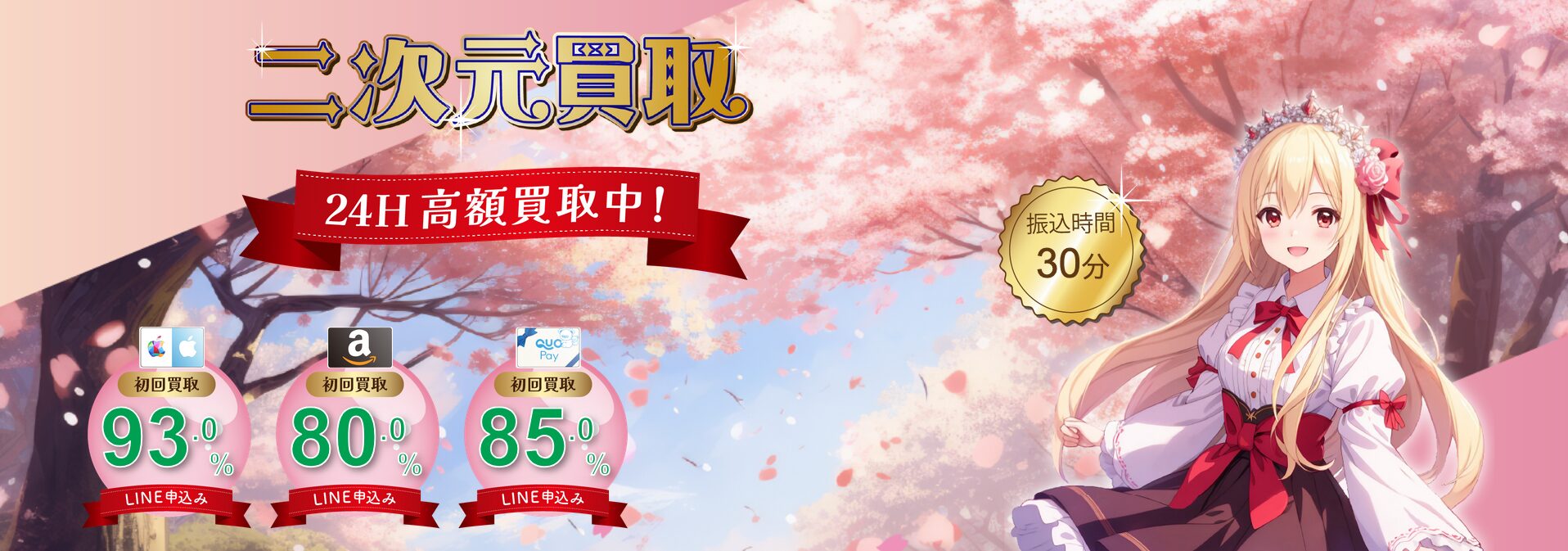 二次元買取は、AppleギフトカードやQUOPayを中心に多様なギフト券を高率で換金したい方に最適です。プリズムワールドグループの10年以上の実績に基づく安全性と、24時間スタッフ常駐による最短5分の振込が強みです。LINE申込+1%の特典も見逃せません。